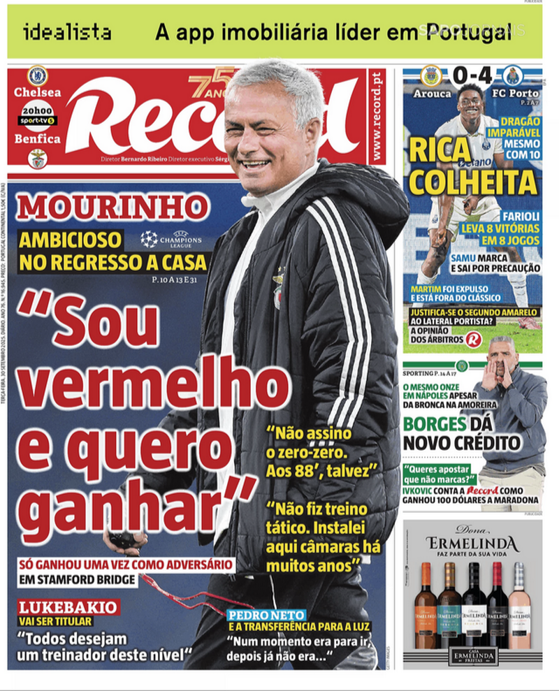 O jornal Record também coloca na manchete o jogo das águias, dando conta da ambição de José Mourinho ao citar o novo treinador do Benfica: "Sou vermelho e quero ganhar".