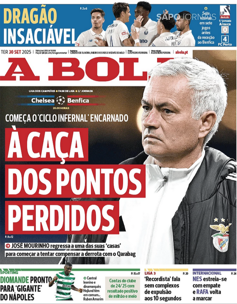 "À caça dos pontos perdidos", titula A BOLA sobre o jogo desta noite do Benfica em Londres, com o Chelsea, acrescentando que "começa o ciclo infernal encarnado".