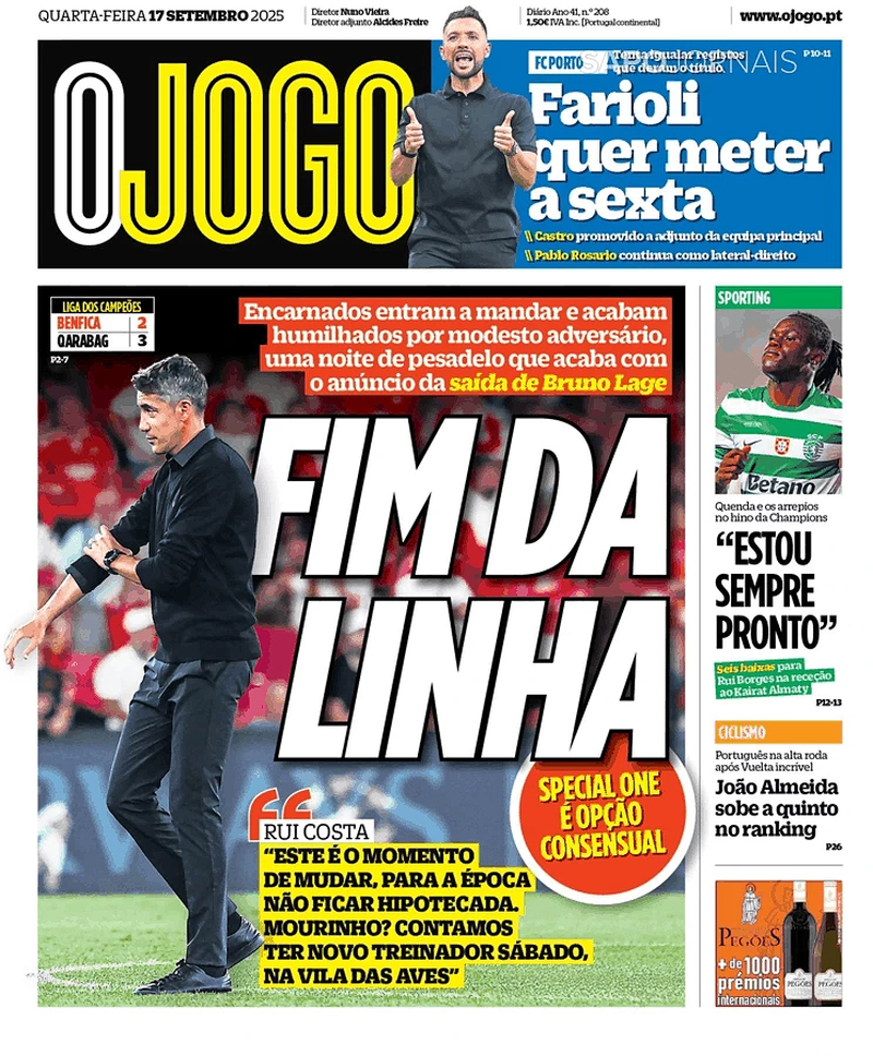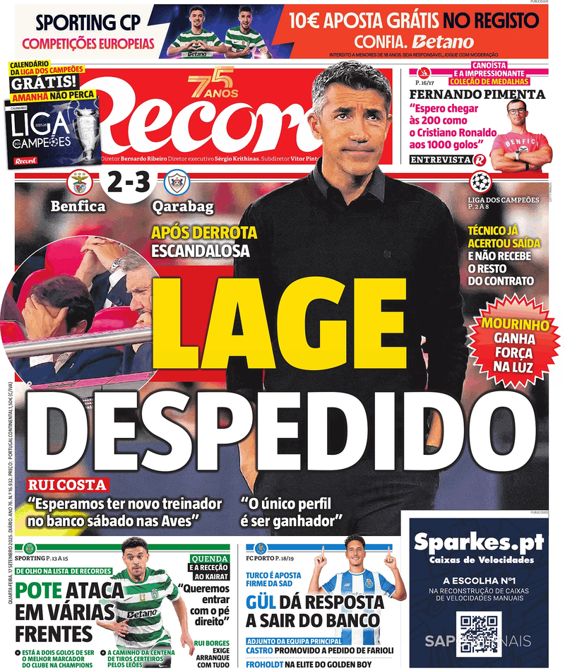 A imprensa desportiva desta quarta-feira dá total destaque à derrota do Benfica diante do Qarabag para a Liga dos Campeões, e consequente despedimento de Bruno Lage.
