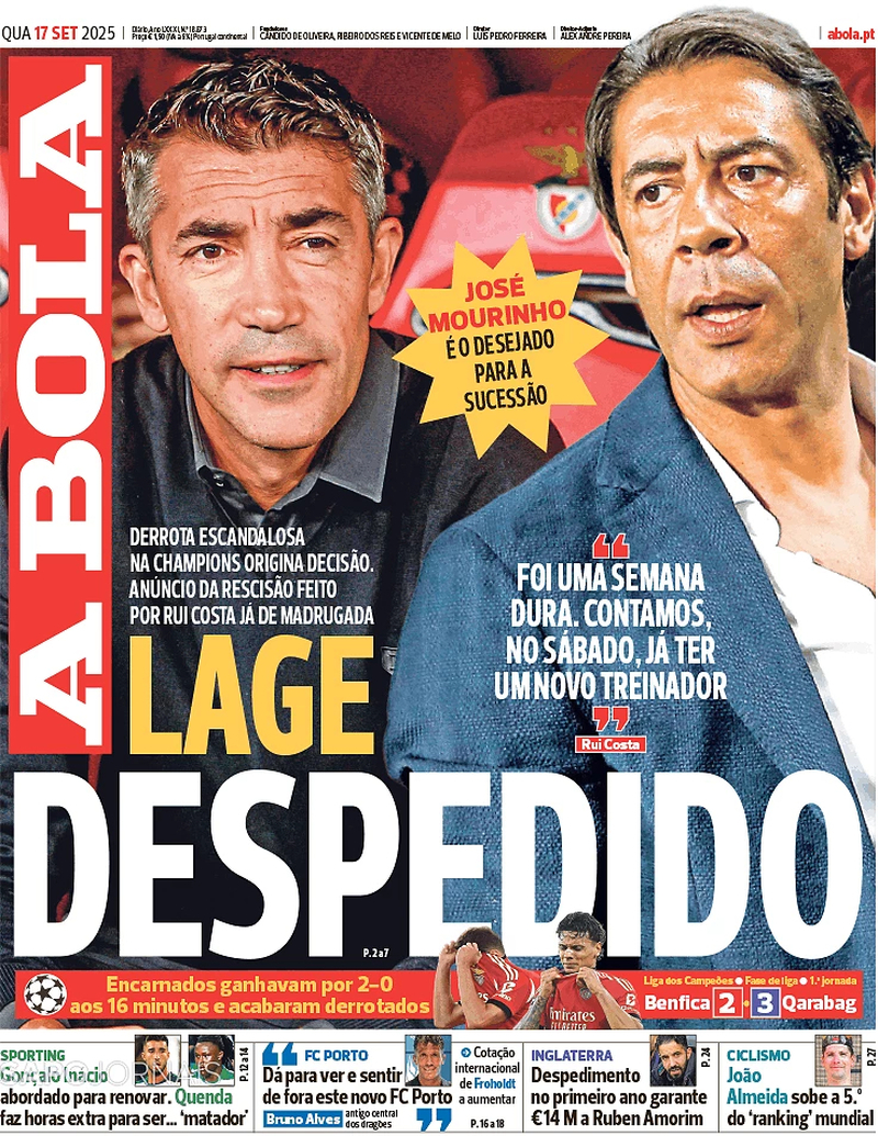 O jornal 'A Bola' destaca as palavras do presidente Rui Costa após "derrota escandalosa" e ainda o nome de José Mourinho como possível sucessor.