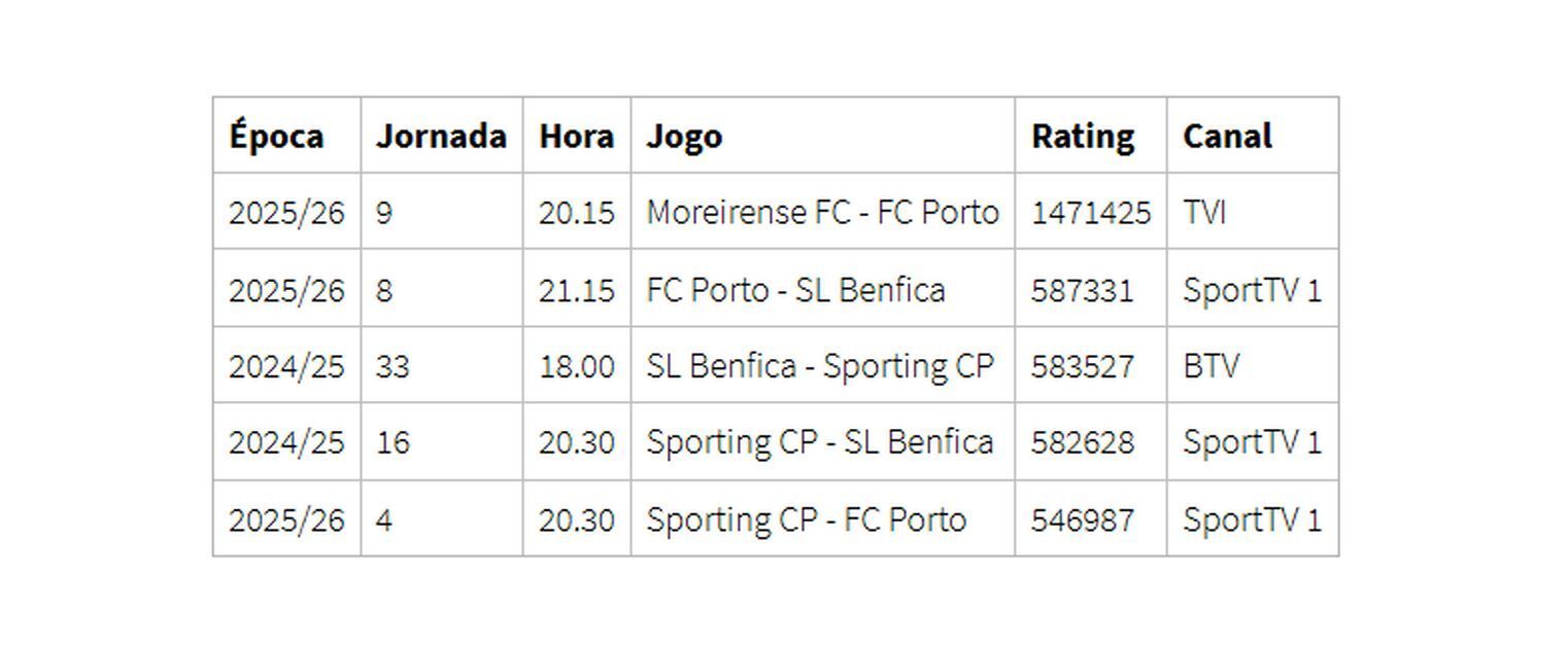 Moreirense-FC Porto foi o mais visto do anoAs audiências dos jogos na I Liga 2025/26 estão a crescer, em comparação com as primeiras nove jornadas da época passada.